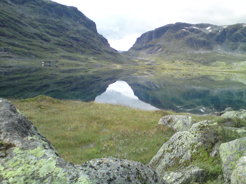 Me ser på fylkesgrensa mellom Hordaland og Telemark langs E134. Denne plassen her er utruleg vêrhardt. Men denne dagen var vatnet blikkstilt.
